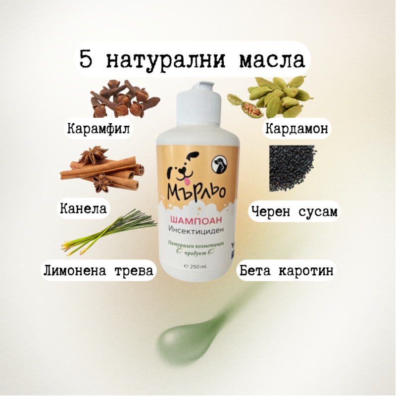 :Натурален шампоан с инсектицидно действие за кучета. Отблъсква бълхи, въшки и кърлежи чрез комбинация от етерични масла – канела, кардамон, лимонена трева и карамфил. Подхранва козината, прави я здрава, мека и блестяща.
