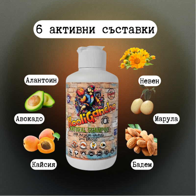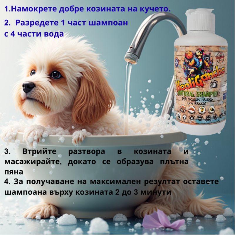 :Шампоан за кучета със среден косъм - укрепва косъма, улеснява разресването, предотвратява заплитане и придава обем и блясък. Обогатен с масла от кайсиеви ядки, бадем, марула, авокадо и невен.