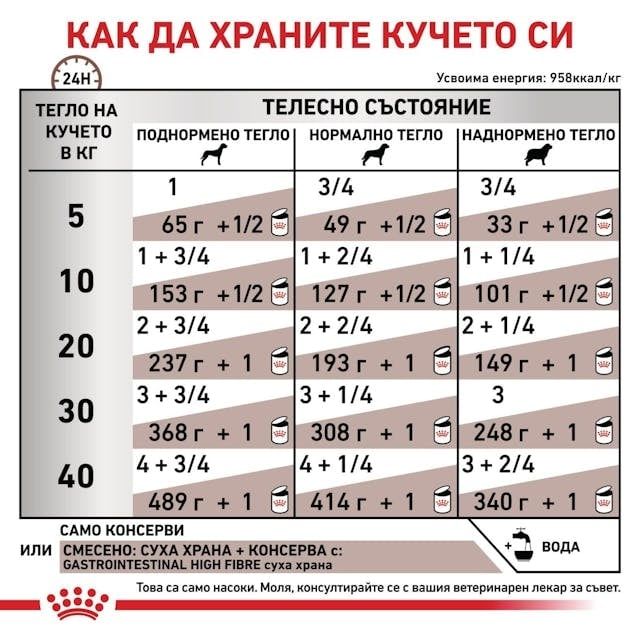 :Винаги се използват ориентировъчни таблици според теглото и активността на кучето, адаптирани към продукта.