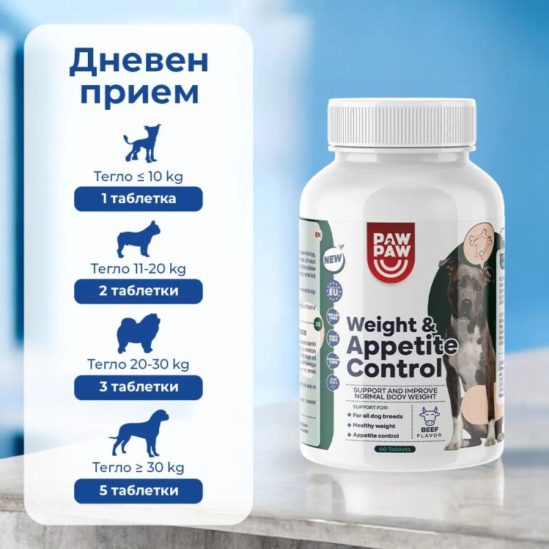 :1 таблетка на ден за кучета с тегло до 10 кг, 2 таблетки на ден за кучета с тегло 11–20 кг, 3 таблетки на ден за кучета с тегло 21–30 кг.3 таблетки на ден за кучета с тегло 21–30 кг, 5 таблетки дневно за кучета с тегло над 30 кг.