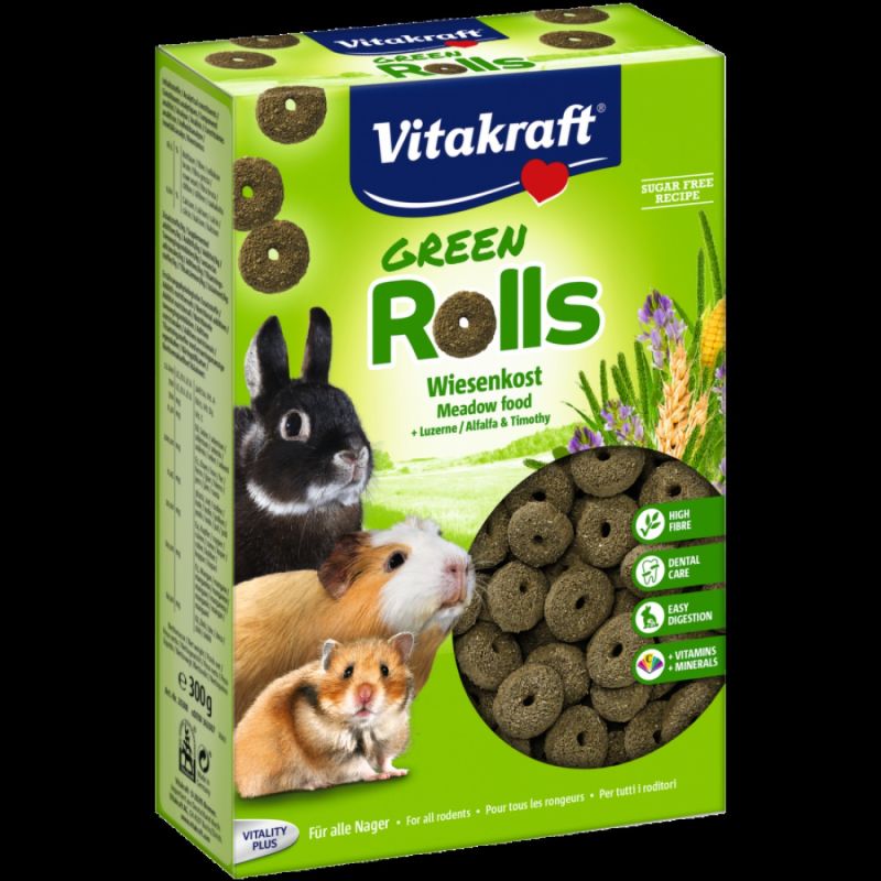 :Vitakraft Green Rolls е растителна допълваща храна за гризачи под формата на вкусни и хрупкави зелени кравайчета. С високо съдържание на сурови влакнини, които подпомагат изтриването на зъбите и улесняват храносмилането. Рецептата е изцяло растителна.