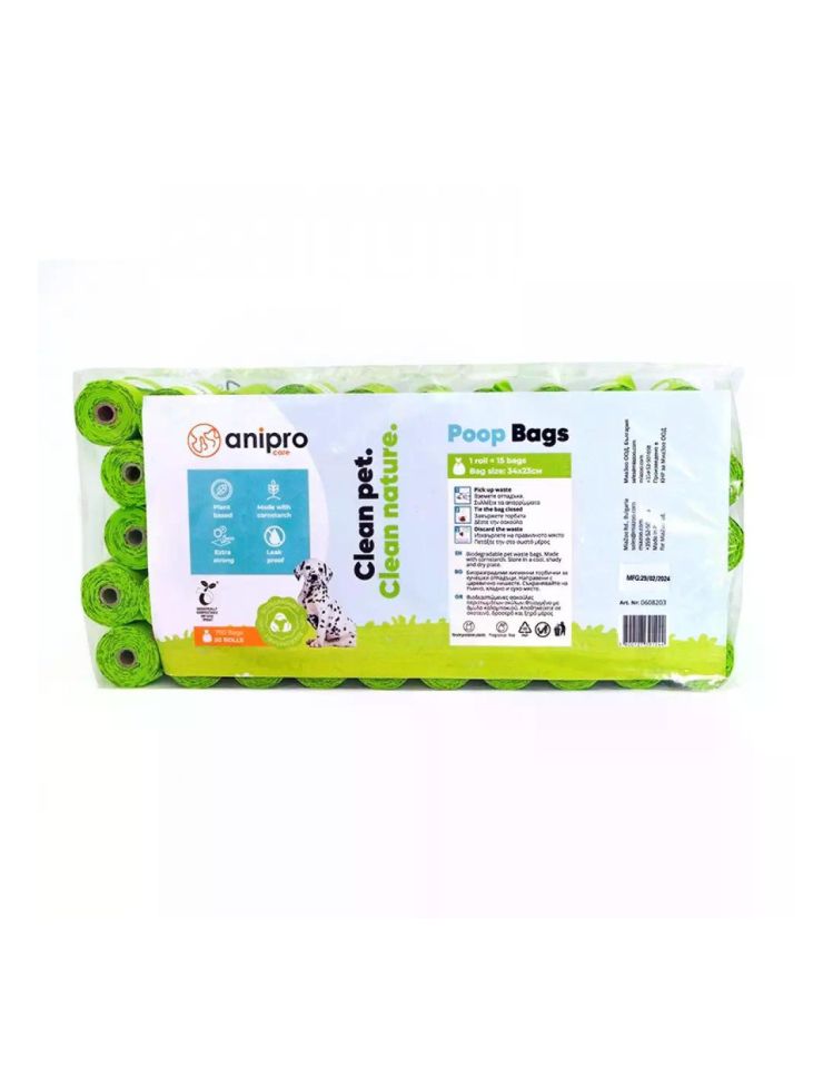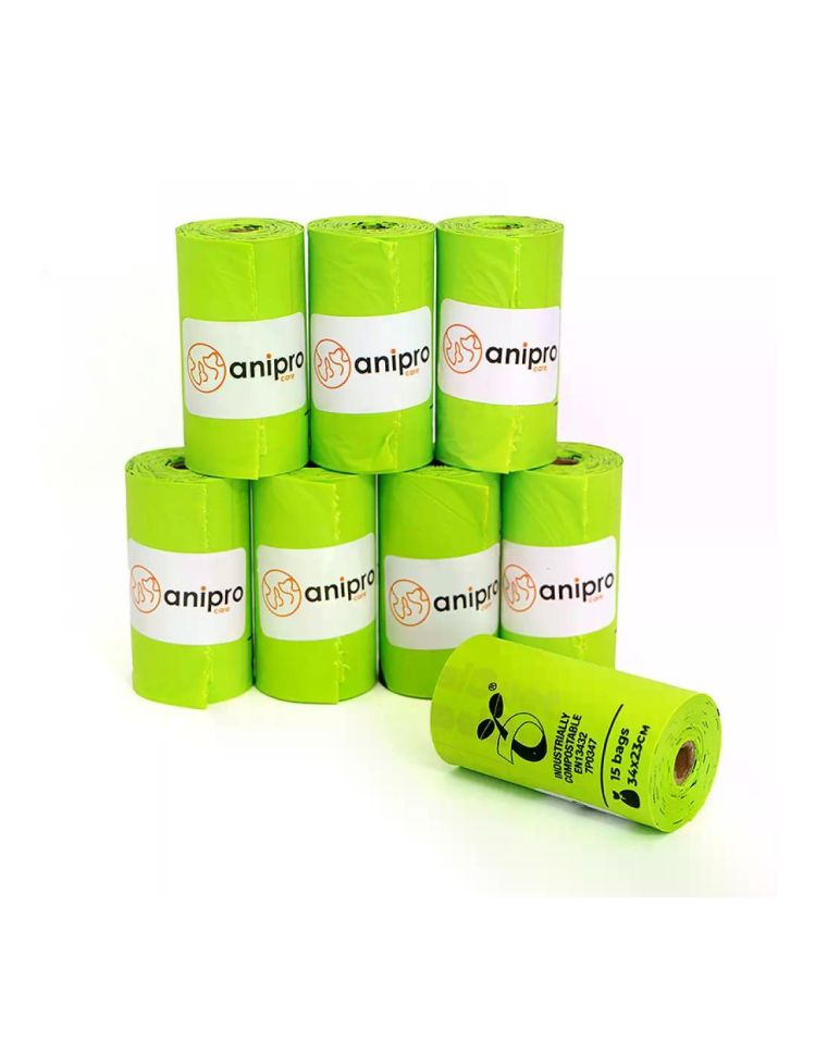 :Компостируеми хигиенни торбички за кучешки отпадъци, изработени от растителна основа – царевично нишесте. Здрави, непропускливи и биоразградими, подходящи за всекидневна употреба.