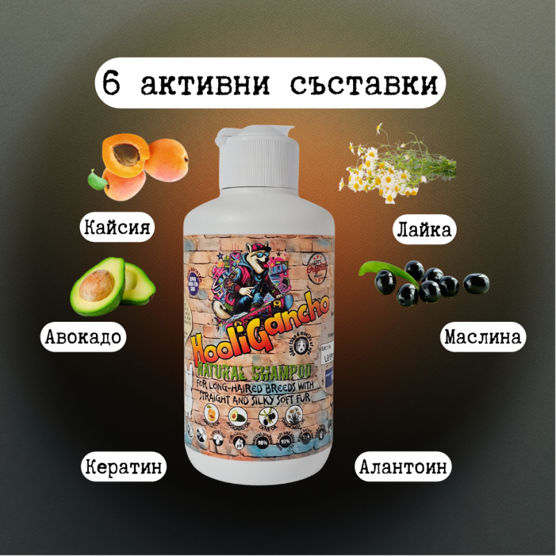 :Шампоан за кучета с дълга козина - възстановява кожата, омекотява косъма, регулира омазняването и намалява пърхота. С масла от авокадо, кайсиеви ядки, маслина, лайка и лютива мента. Оставя козината мека и блестяща.