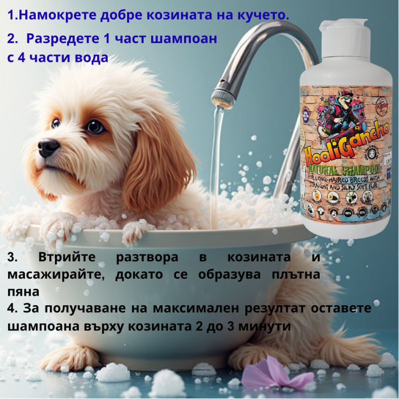 :Намокрете добре козината. Разредете 1 част шампоан с 4 части вода. Нанесете и оставете 2-3 минути. Изплакнете обилно.