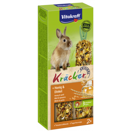 Оригинален Vitakraft Kracker за декоративни зайци с мед и спелта. Троен изпечен слой върху дървена пръчица за дълго гризане и изпиляване на зъбите. Без захар, с витамини и минерали. Опаковка от 2 броя.