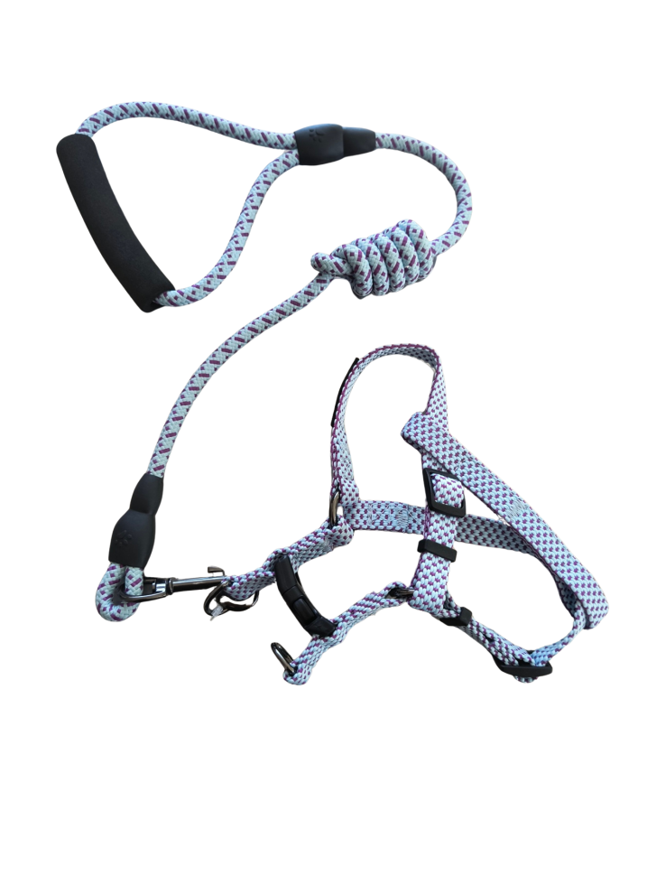 Комплектът съдържа регулируем нагръдник и издръжлив повод от плетено въже, предназначени за малки породи кучета. Нагръдникът осигурява адаптивно прилягане и стабилност по време на движение, като разпределя натиска равномерно. Поводът е изработен от здраво въже и разполага с мека дръжка за по-удобен захват. Сивият плетен десен е лесен за съчетаване и подходящ за ежедневна употреба.