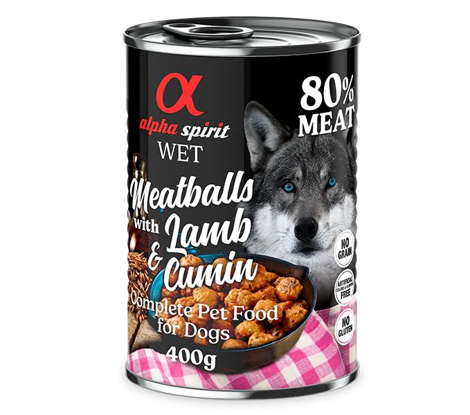 Alpha Spirit Meatballs with Lamb & Cumin е висококачествена мокра храна за кучета, създадена от 100% натурални съставки. Всяка консерва съдържа нежни кюфтенца от агнешко месо, подправени с кимион – вкусна комбинация, която стимулира апетита и подпомага храносмилането. Рецептата е богата на животински протеин и омега мастни киселини от зехтин, които подпомагат здравето на кожата и козината.