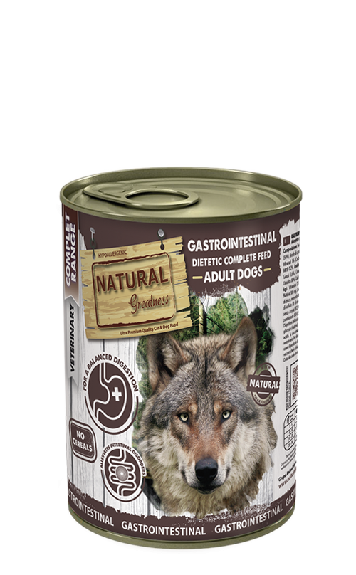 Natural Greatness Veterinary Diet Gastrointestinal е специализирана диетична храна, разработена за възрастни кучета с остри или хронични храносмилателни проблеми.