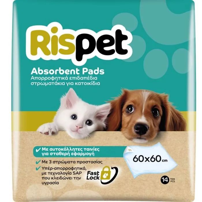 Rispet - подложки за куче/котка 60х60 големи абсорбиращи подложки за домашни любимци с висока попиваемост и самозалепващи ленти в четирите края. Осигуряват стабилно прилепване към пода, не пропускат влага и неутрализират миризми. Подходящи за тоалетно обучение, инконтиненция и периоди на разгонване.