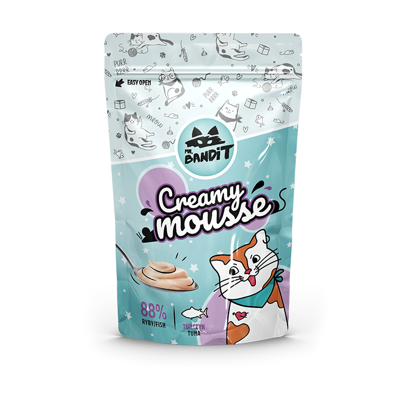Състав:Риба тон 84%, хидролизат от риба тон 4,6%, нишесте 1%, гума от рожкови семена 1%, минерали 0,5%, рапично масло 0,4%
