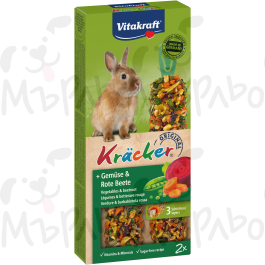Оригинален Vitakraft Kracker за декоративни зайци със зеленчуци и червено цвекло. Троен изпечен слой за дълго гризане и изпиляване на зъбите. Рецепта без захар, с витамини и минерали.
