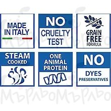 :Прясно пуешко месо (46%), пуешки бульон, картофи (4%), продукти от мая (2%), минерални соли, юка шидигера (0,025%)