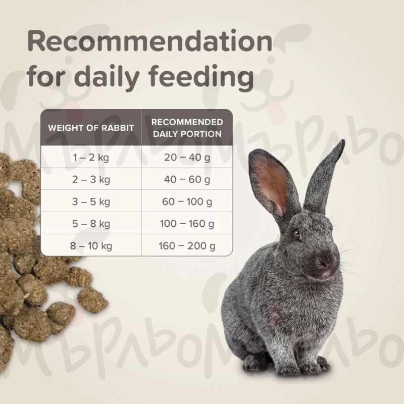 :Приблизителни ориентири за 24 часа: зайци 1-2 кг - 20-40 г, зайци 2-3 кг - 40-60 г, зайци 3-5 кг - 60-100 г, зайци 5-8 кг - 100-160 г, зайци 8-10 кг - 160-200 г. Храната може да се поднася на едно или две хранения дневно. Винаги осигурявайте вода.