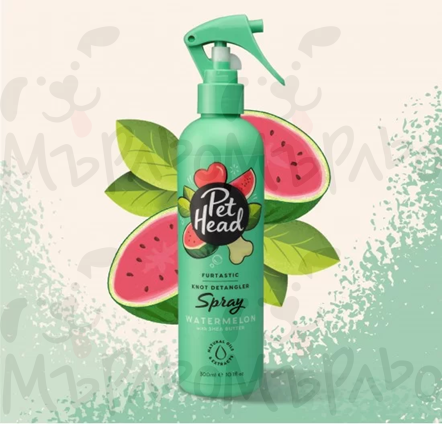 :Спрей за разресване с аромат на диня, обогатен с масла от ший, кайсиеви ядки и пустинен пъпеш Калахари. Подходящ за кучета с дълга и къдрава козина.