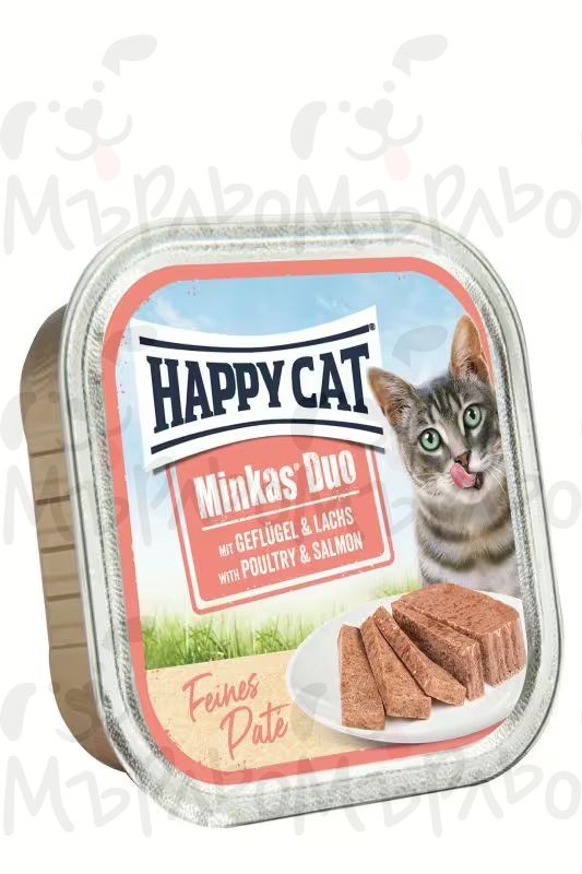 Happy Cat Minkas Duo Poultry & Salmon 100 g е беззърнест пастет за котки с апетитна комбинация от птиче месо и сочна сьомга. Нежната текстура и богатият вкус го правят подходящ за ежедневно хранене, включително за по-капризни котки. Формулата съдържа инулин за подпомагане на храносмилането и чревния баланс. Без глутен, зърнени храни, изкуствени оцветители, вкусове, консерванти и ГМО.