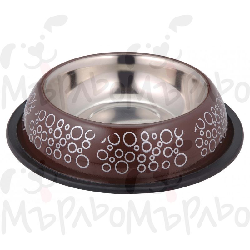 Метална купа Anipro Bubbles, Ø15.5 см / 0.2 л – кафява. Изработена от инокс с гумено дъно против хлъзгане. Лека, хигиенична и устойчива. Подходяща за котки и малки кучета. Декорирана с модерен „bubbles“ дизайн.