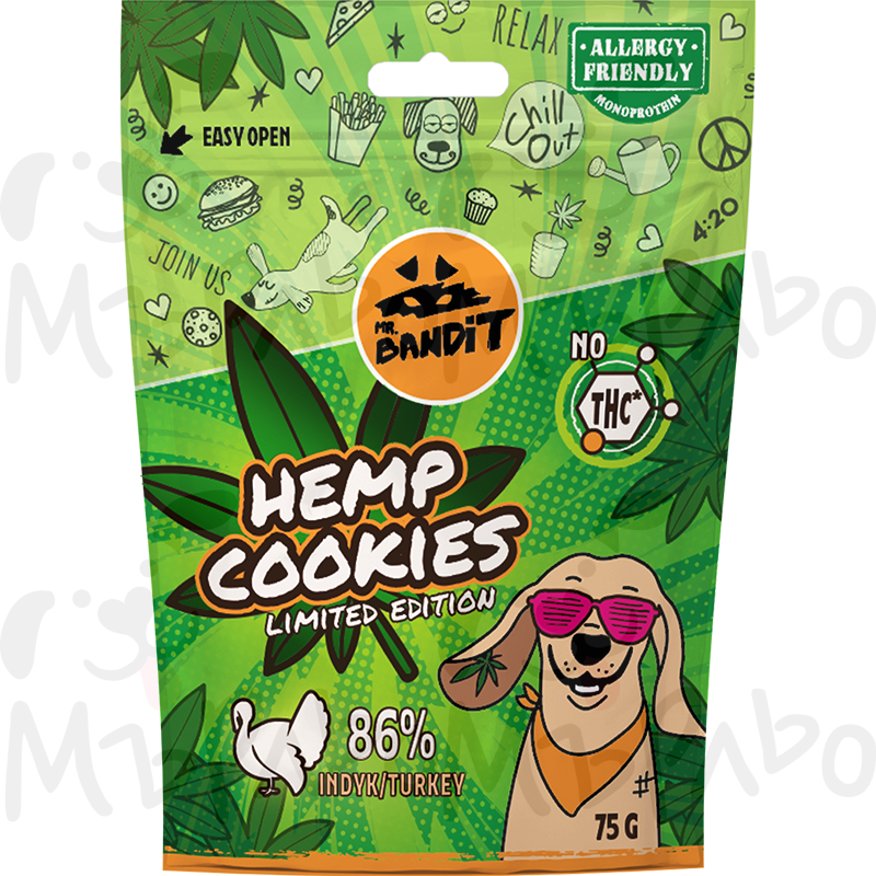 Mr. Bandit Hemp Cookies Limited Edition е натурално лакомство за кучета с пуешко месо и коноп, създадено за поддържане на жизненост и добро настроение. Лакомството е с изчистен състав, без изкуствени добавки, подходящо за кучета с чувствителност към храна. Конопените семена осигуряват полезни мастни киселини и фибри, които подпомагат храносмилането и имунната система. Вкусна и безопасна награда за всеки ден.