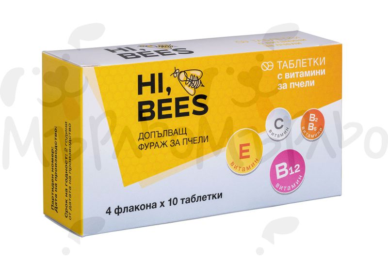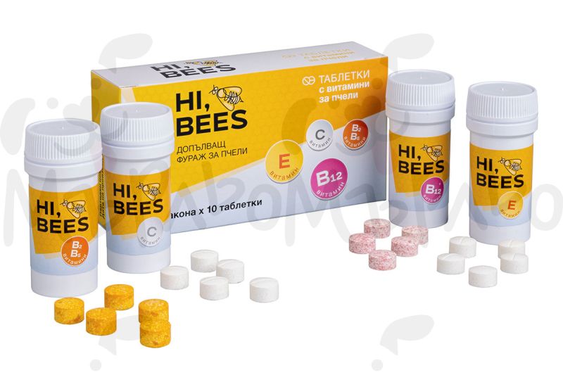 Витамини HI, BEES (4 флакона х 10 таблетки) – комплекс от витамини B2, B5, B12, C и E за пчели, подпомагащ имунната и нервната система, жизнеността и производството на пчелно млечице. Силен антиоксидантен ефект, който подобрява устойчивостта и продуктивността на пчелните семейства.
