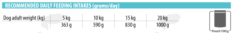 Кучета до 5 кг - 2-3 пауча дневно; при по-големи кучета - комбинирай с гранулирана храна.