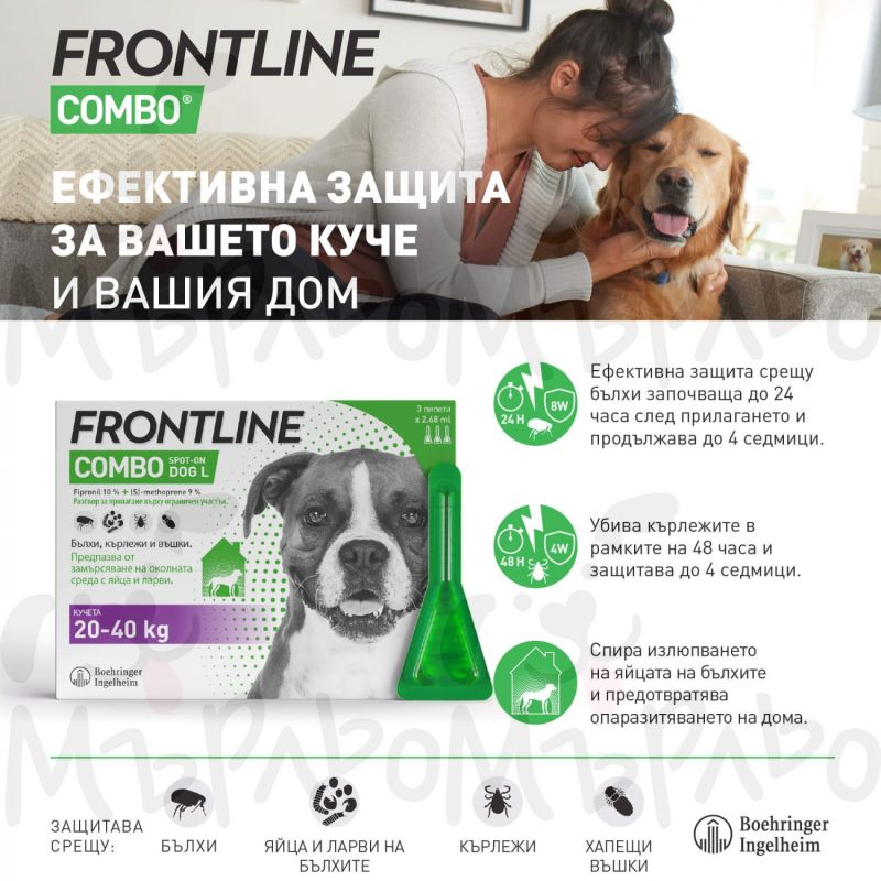 Frontline Combo spot-on Dog 20–40 кг е ветеринарномедицински продукт за външно приложение при кучета, предназначен за лечение и профилактика на опаразитяване с бълхи, кърлежи и хапещи въшки. Съдържа две активни съставки – фипронил и (S)-метопрен, които осигуряват пълна защита чрез двойно действие.