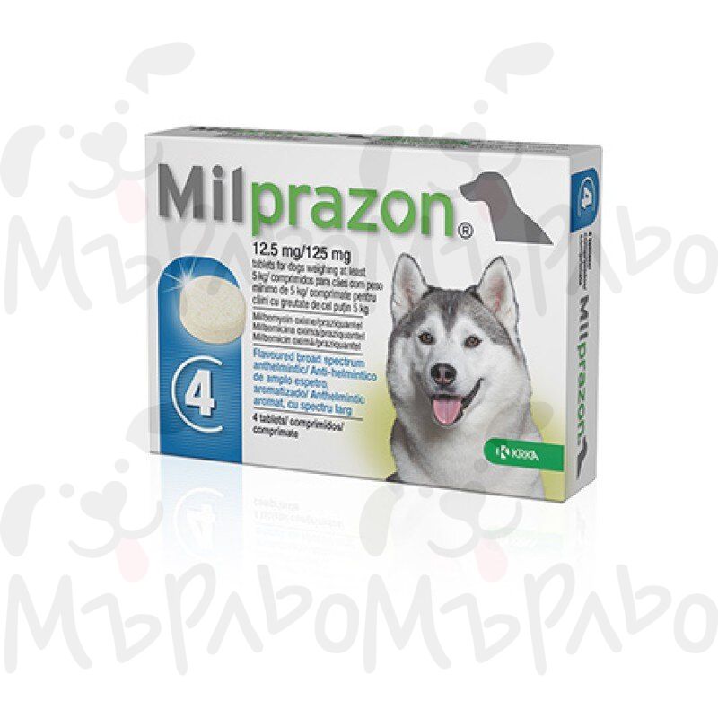 Противопоказания: Милпразон 12,5 мг/125 мг таблетки: Да не се използва при кучета с тегло по-малко от 5 kg. Да не се използва при свръхчувствителност към активните субстанции или към нясой от ексципиентите.